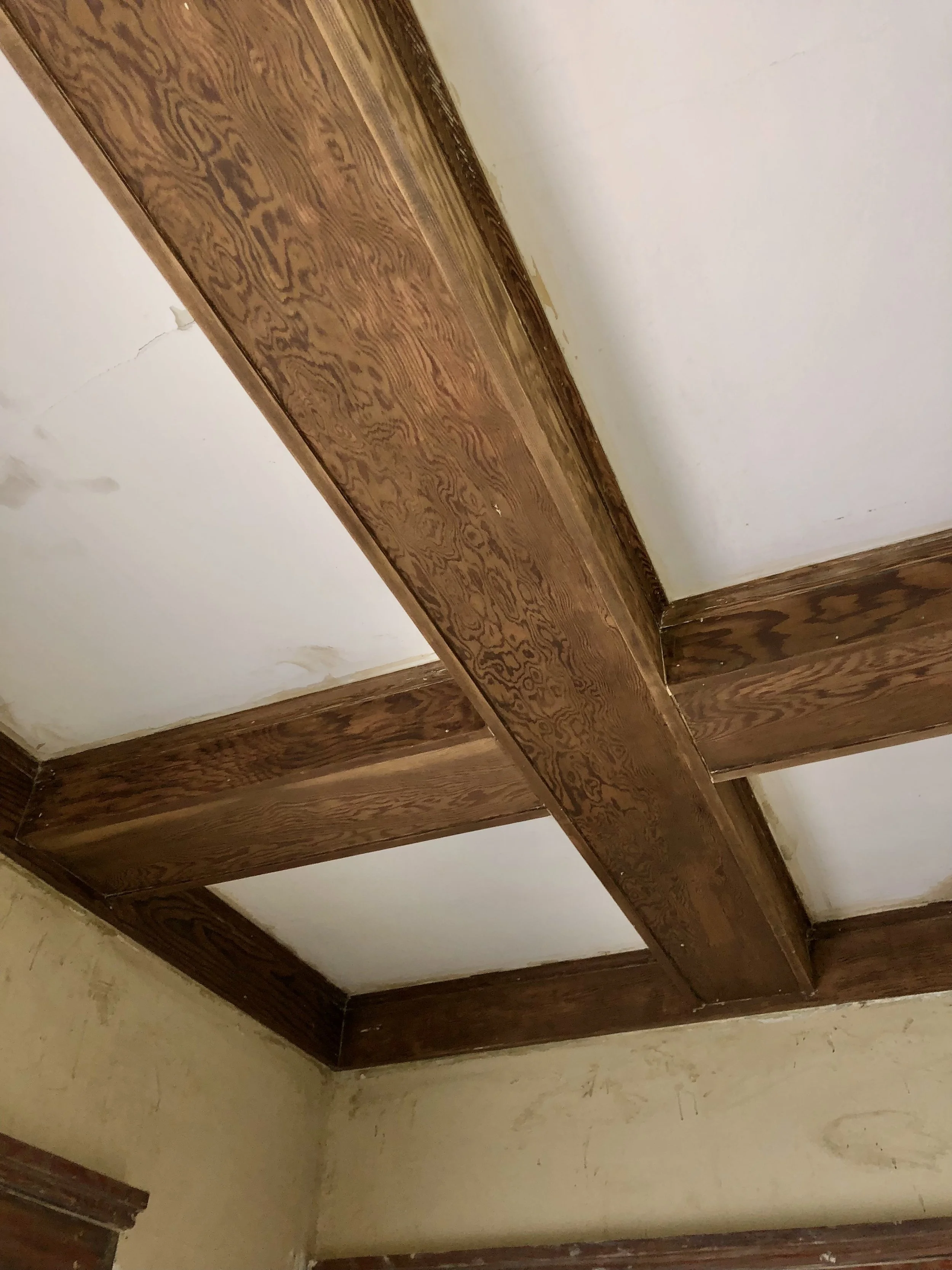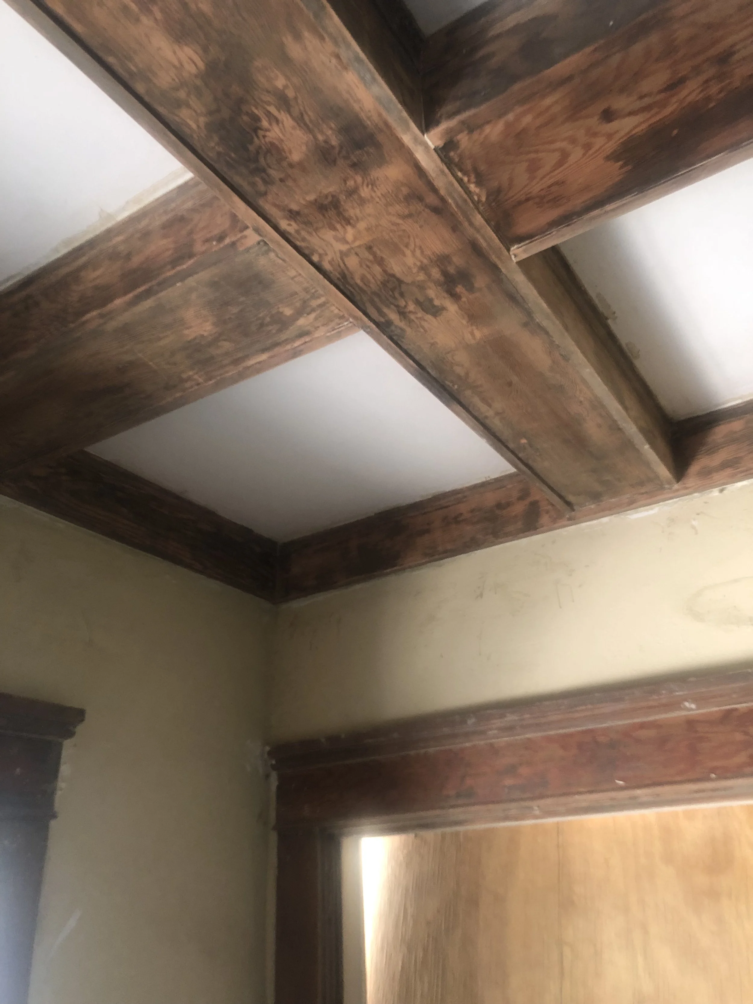 We returned in the afternoon to see that the whole ceiling had been brushed. And you know what? It looked pretty darn good! It was an even brown tone, the grain looked good, and there was no blotchiness! On Saturday morning I wondered if it would have dried to a funny fir-pink, but we went back and looked and it still looked even and brown! It’s not over, but it’s looking like this cockamamie, expensive plan of ours may yield something decent.