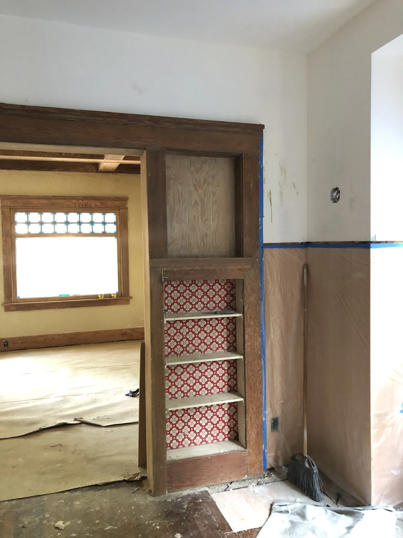 The dining room, at least, had far less wood to strip: just the old casing and two double-hung windows and the cased opening between the living room and dining room. There are no ceiling features and no built-ins. Even the picture rail wasn’t original—it had been replaced with a tiny cove molding for reasons I cannot guess at. We removed the baseboards because of the new board and batten wainscoting that’s going in. The character of these rooms is changing so much!