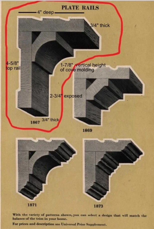 We based our plate rail on the upper one that is circled. The measurements indicate the dimensions from another page of the catalog, but we didn’t use them exactly (e.g., our plate rail is 1” thick). I think we had it all milled. Even though we can’t just order from the 100 year old catalog, referring to these has been so helpful in seeing what was available in the period, narrowing down what is appropriate for the house, figuring out the component parts of things, and giving the millwork shop something to work from.