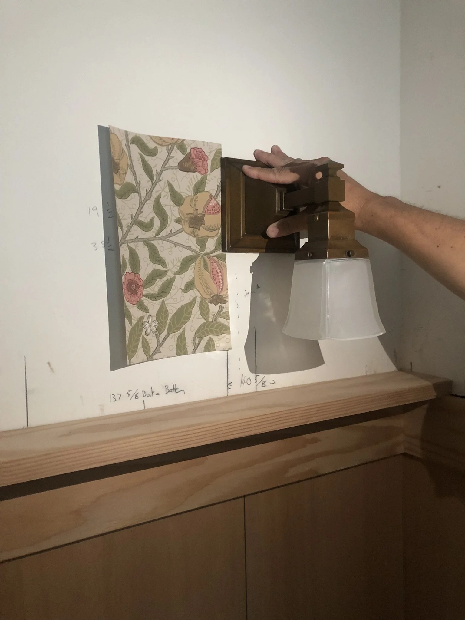 Then things really got exciting when I had to hold my breath and go get a sconce from the garage to make sure it wasn’t going to sit with its shade too close to the plate rail! These fixtures can be mounted in either direction (shade up or down), but I know I want them to face down, like they’ll be in the matching pendant in the middle of the room. That’s the wallpaper that we’ve chosen for this space, too—looks good with the metal finish that I chose months and months ago! Whew! (The wallpaper is Morris & Co., “Fruit” in limestone/artichoke.)
