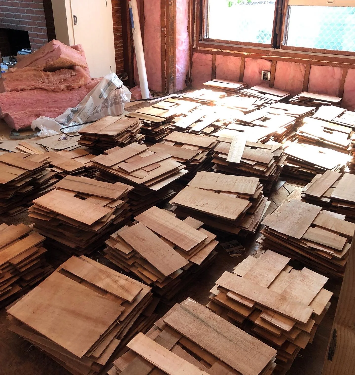 A big pallet of cedar shingles arrived on a truck one day. They had come from the Pacific Northwest, and wouldn’t you know it, like many things in the Pacific Northwest, they turned out to be damp. Too damp to paint in that condition! So they had to set up stacks and stacks of shingles, taking up the floor of three or four rooms of the house with fans blowing on them. As they registered as dry enough with a moisture meter, they were moved outside for the painters to work on.