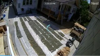 The view from the camera mounted on the garage showing the driveway covered in plastic with shingles laid out to dry. The prepared shingles were stockpiled inside, below.